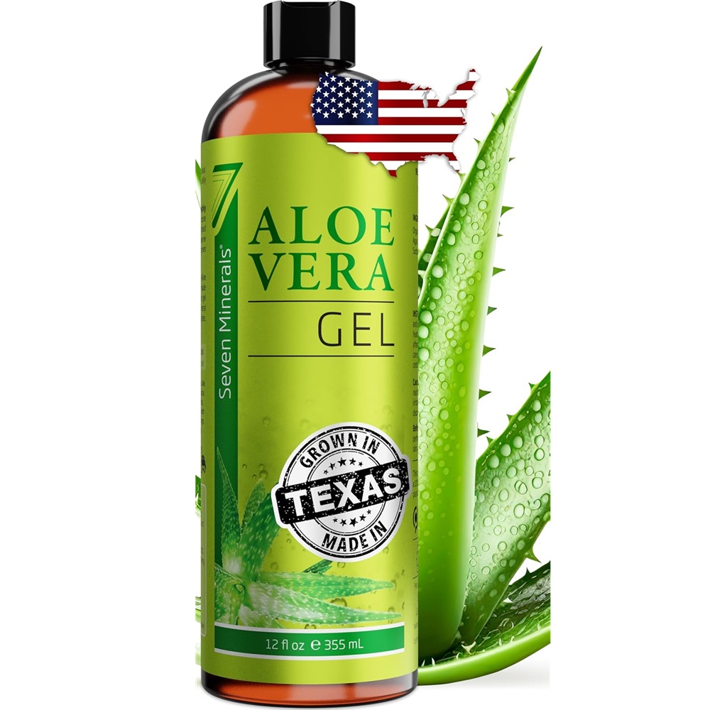 Seven Minerals Organic Aloe Vera Gel from freshly cut 100% Pure Aloe – Big 12oz – HighestQuality, Texas grown, Vegan, Unscented – For Face, Skin, Hair, Sunburn relief